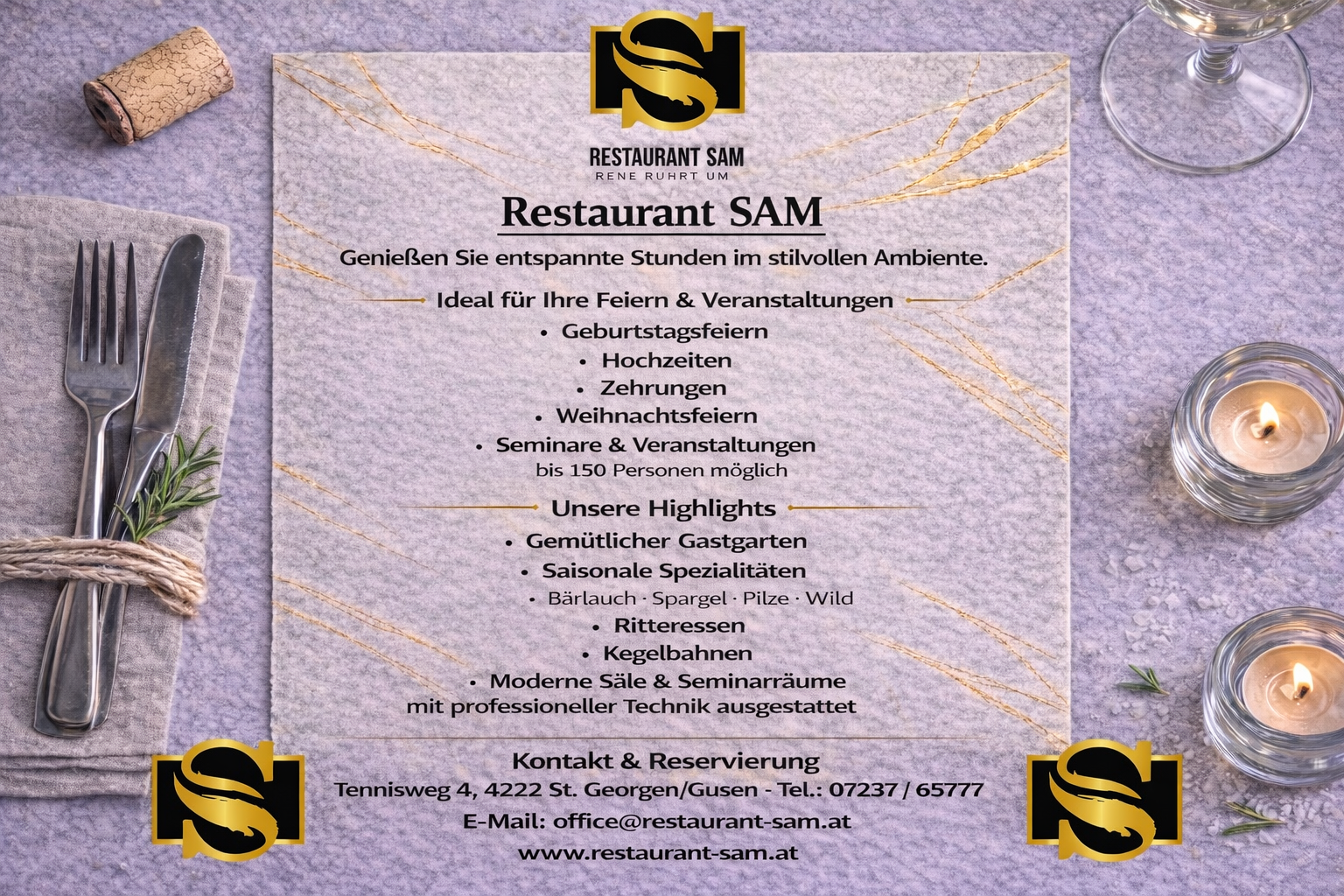 Wir im Restaurant SAM heißen Sie in St.Georgen an der Gusen herzlich willkommen! Wir laden Sie ein, unsere authentische österreichische gourmet Küche zu genießen. Erleben Sie fantastisches Gourmet-Essen, hausgemachte Küche, lokale Produkte und traditionelle Küche, serviert von unserem freundlichen Personal. Setzen Sie sich hin und genießen Sie unsere fachmännisch zubereiteten Speisen, die für jeden Geschmack etwas bieten. Hier können Sie sich mit unseren köstlichen Desserts verwöhnen lassen. Ihre Ernährungsbedürfnisse sind uns wichtig, deshalb bieten wir eine Auswahl an veganen und vegetarischen Optionen an. Ergänzen Sie Ihre Mahlzeit mit leckerem Bier, Wein, Kaffee und Tee. Genießen Sie in ruhiger, entspannter Umgebung ein schmackhaftes Mittag- und Abendessen.
